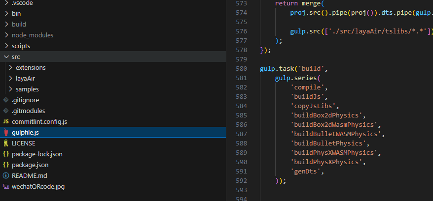 Looking at the task code, it becomes even clearer. The copyJsLibs task uses gulp.src() to specify the file rules to be processed, and then uses gulp.dest() to copy the matching files to a designated directory. In the physics engine library task code, it's also clear that each LayaAir physics engine library is a new library created by merging the LayaAir engine's physics adaptation code with a third-party physics engine's JS library.