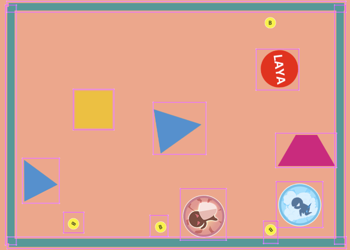 开启后,场景中会显示刚体所使用的碰撞盒、圆形、多边形等实际参与物理计算的形状,如图 1-4 所示。通过该可视化信息,可以直观确认碰撞体的大小、位置与旋转是否与美术节点对齐,常用于排查“看起来碰到了但没有触发碰撞”或“碰撞范围异常”等问题。