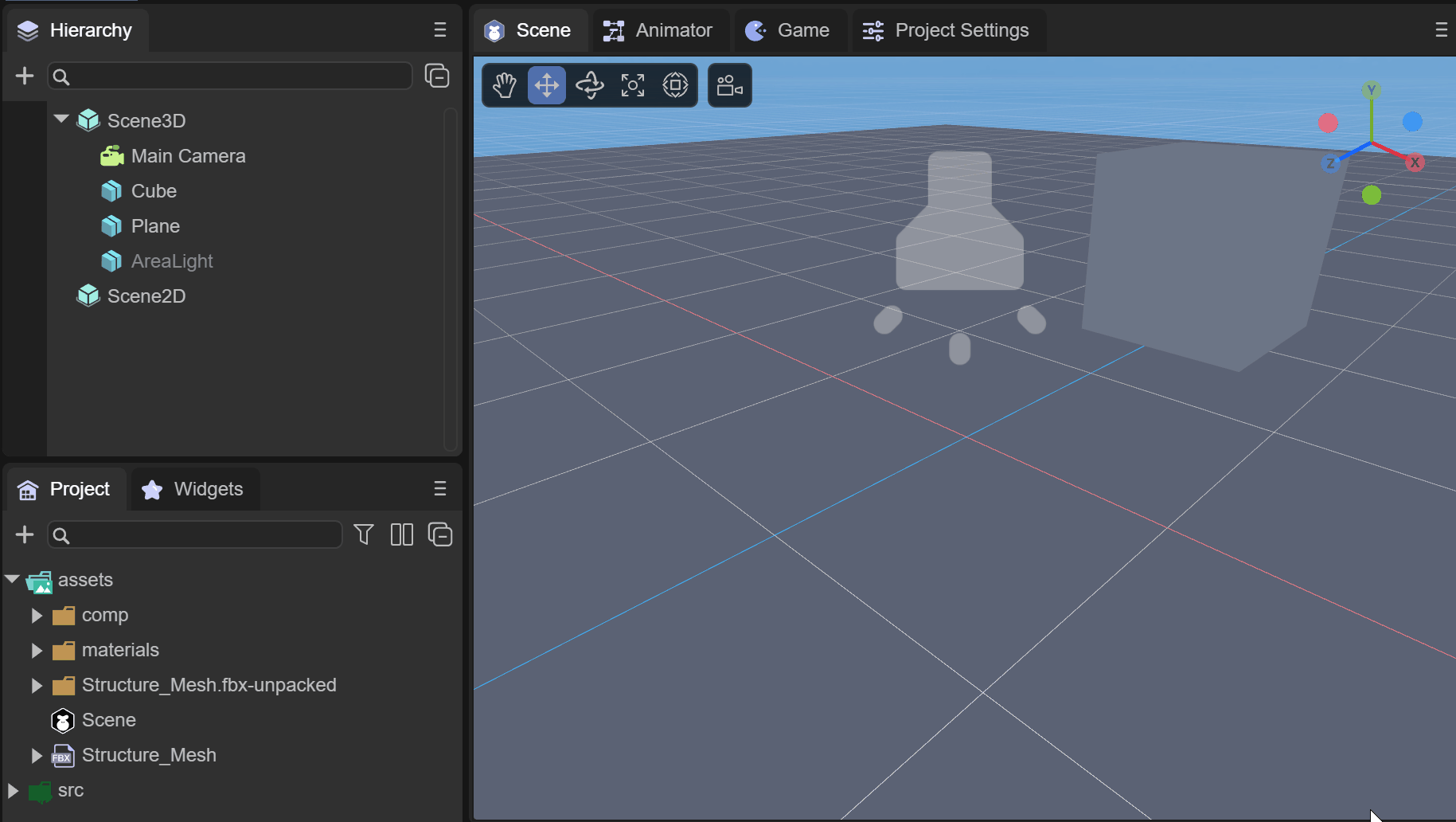 如动图3-2所示,在Scene3D或者任意节点下,鼠标右键选择Light,点击DirectionLight,即可在场景中创建一个平行光。
