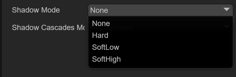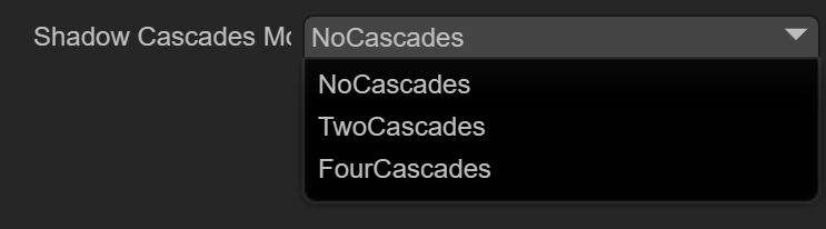 shadowCascadesMode:阴影的级联模式,数量越大,产生阴影贴图时,将视锥体划分的子视锥体越多,对应的阴影贴图也越多,阴影的质量会越好。