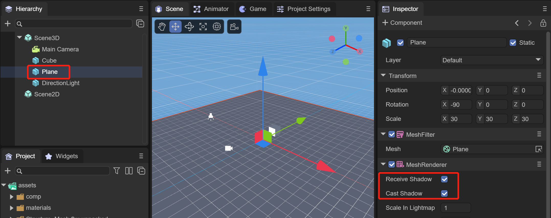 castShadow:是否产生阴影,当模型此属性为true时,灯光根据产生阴影的模型位置、模型网格形状大小、与灯光的角度等进行阴影计算,然后在接受阴影的模型上产生阴影。比如场景中的角色、NPC等活动游戏元素可以开启此属性。