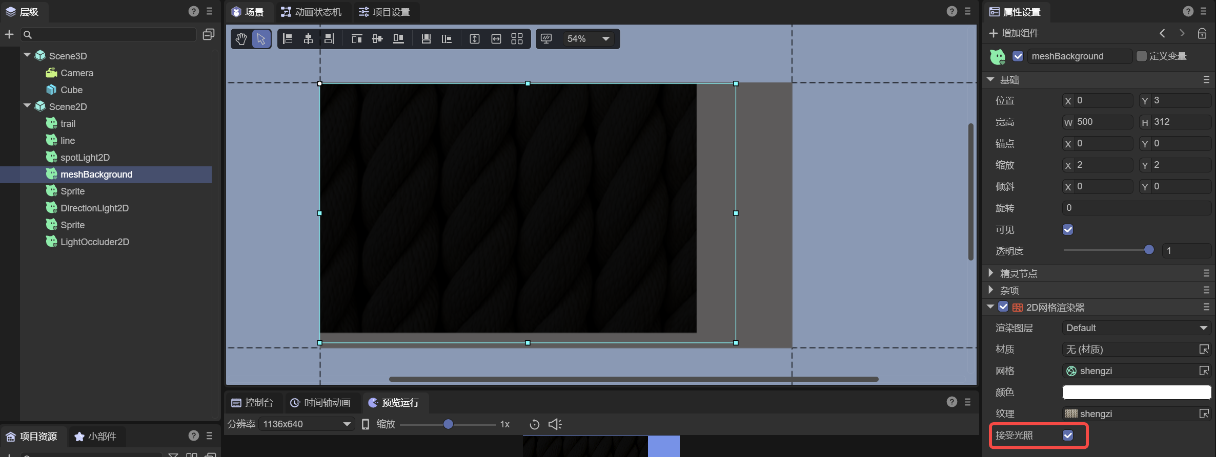 2D灯光必须作用于2D网格才能产生效果。要启用灯光效果,需要在目标精灵节点上添加2D网格渲染器(Mesh2DRender)组件,并勾选"接受光照"选项,这样该节点就能接收光照了。如图1-1所示。