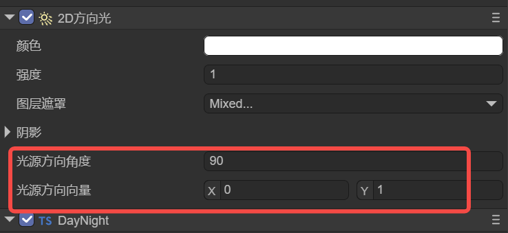 | directionVector | 光源方向向量 | 基于二维向量,精确设置光照方向,对阴影产生影响。当设置新的向量时,会自动更新光源方向角度。 |