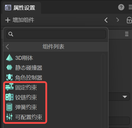 LayaAir3的物理约束组件有四种,分别是,固定约束、铰链约束、弹簧约束、可配置约束,如图2所示,