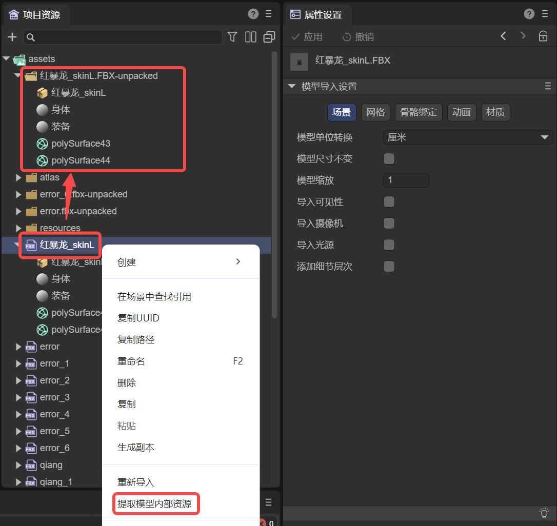 所以,我们建议使用右键菜单中提取模型内部资源的功能,将模型提取出来,如图1-3所示。