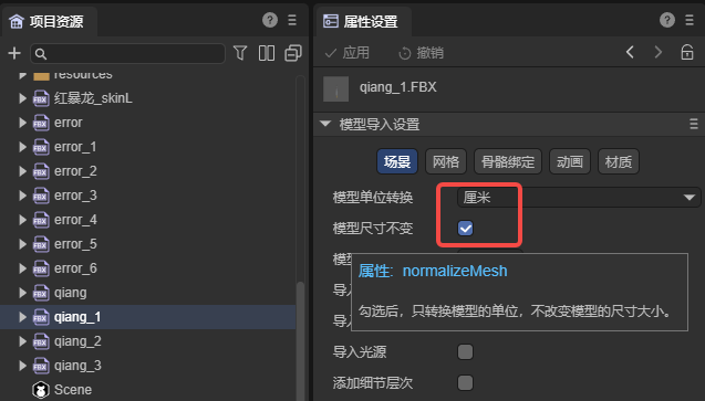 当选中某一模型后,可以在属性设置面板修改模型导入的设置,每次修改后点击应用,会根据修改后的属性重新进行导入。