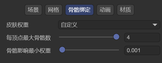 用于设定一个最小权重值。导入带有骨骼动画的模型时,如果某个顶点受某个骨骼的影响权重小于该阈值,则该影响将被忽略。该参数通常用于剔除几乎没有变形作用的骨骼影响,以优化性能和清理数据。