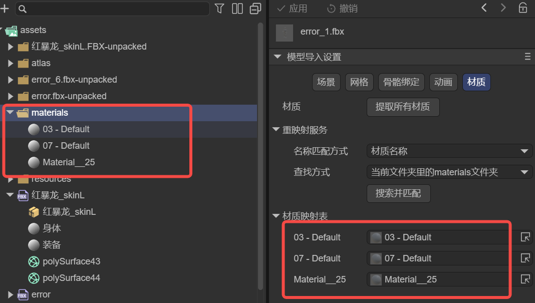 前文曾提到,模型内部的材质是无法修改的。我们给予了提取资源内部模型的建议。如果不经常对模型数据进行更改,我们也可以不提取模型,只提取材质,通过材质映射表来关联需要修改的材质。