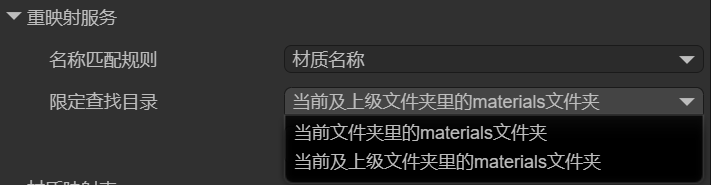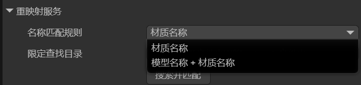 对于材质的映射,也可以通过搜索匹配的方式来映射。该种方式有两个条件参数,分别是名称匹配方式naming和查找方式search。