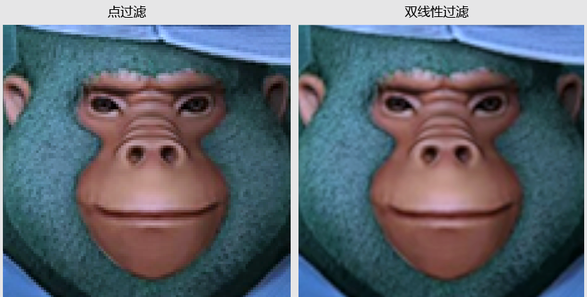 与点过滤相比,双线性过滤会在像素边缘产生柔和过渡,从而显著减少锯齿现象。但在纹理被大幅放大时,插值过程会导致画面略微模糊。对比效果如图2-10所示。