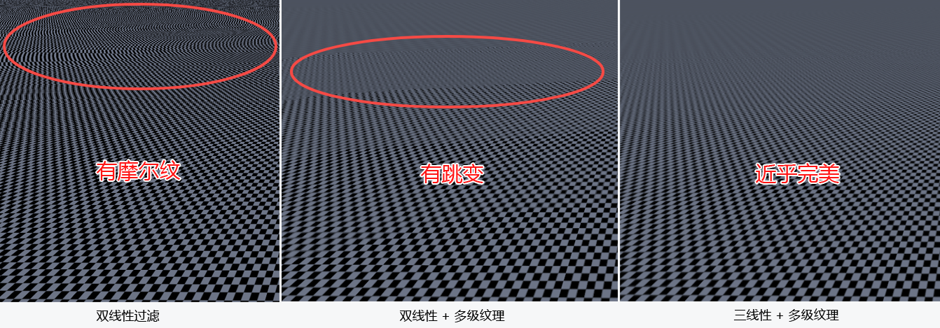 为了防止远处细节过多导致像素闪烁(即“摩尔纹”现象)与跳变现象,通常使用多级纹理技术与三线性过滤结合处理。