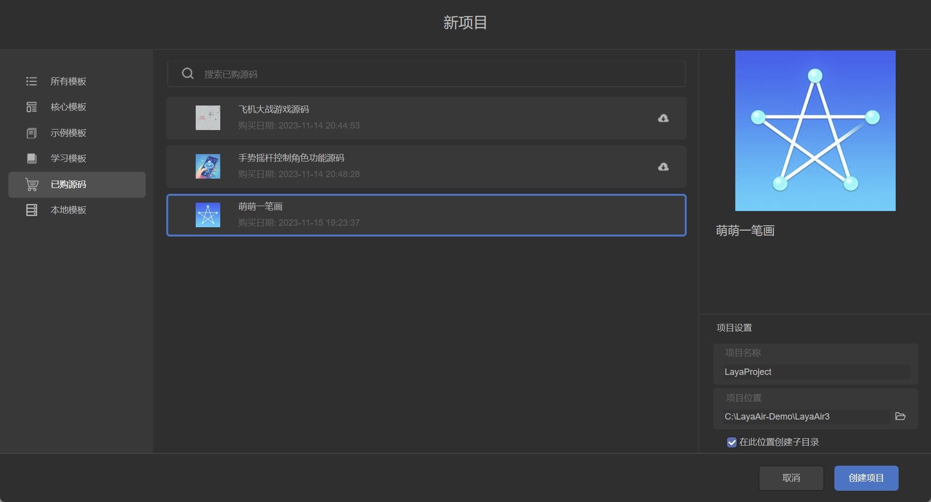 无论是免费添加还是付费购买,一旦成功添加至我的资源。打开LayaAir3-IDE登录(与资源商店相同的帐号),在创建项目的面板里,选择 已购源码 再选中目标的源码资源,即可以该源码为模板,创建一个新的项目。如图1-2所示。