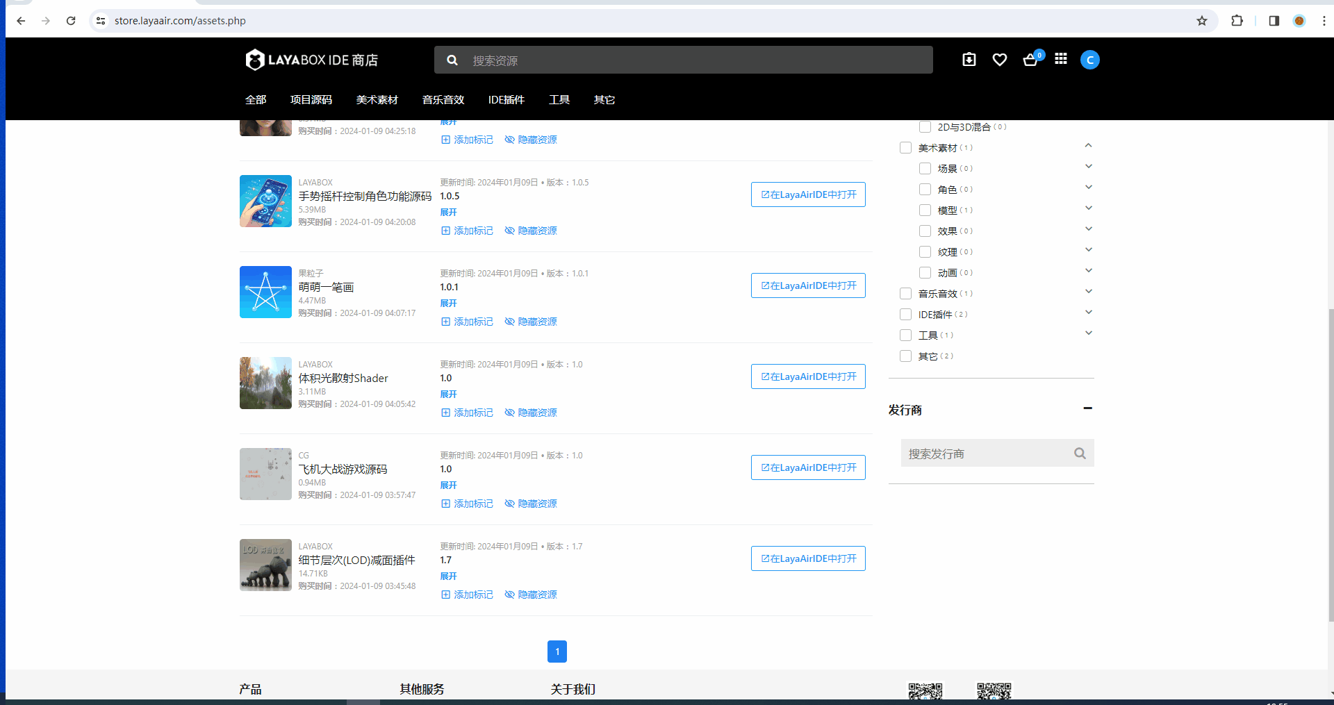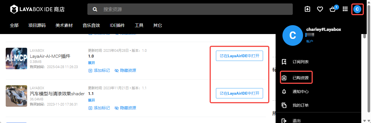 当我们在资源商店里将资源添加至我的资源后,可以在 已购资源 列表中找到,并点击 “在LayaAirIDE中打开”,如图2-1所示。