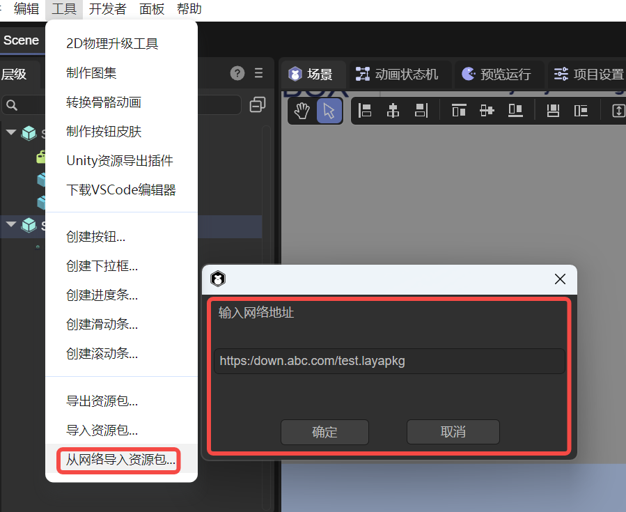 我们也可以使用可访问的网络地址导入(只能是IDE导出的资源包.layapkg后缀),操作路径为:工具 -> 从网络导入资源包,如图2-4所示。