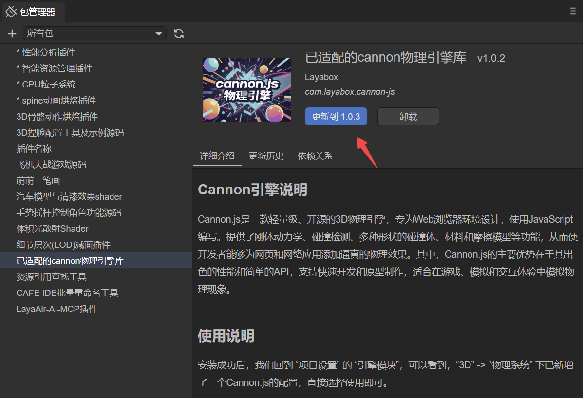 需要重点说明的是,资源包的更新,必须要前往资源商店网页的 已购资源 列表中进行操作,先把最新的版本在已购列表中手动同步(更新),包管理器中无法主动对未操作更新的版本进行更新(即使看到更新按钮,未在网页中同步前,也无法成功更新至最新版本)。