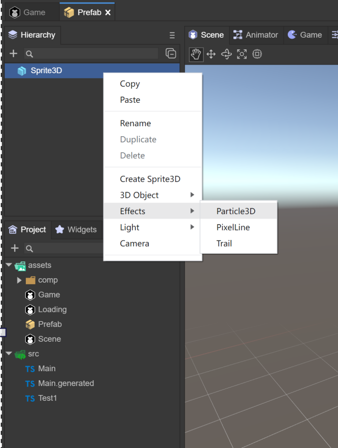 如果考虑到3D粒子是需要复用的,建议使用预制体,在Assets下创建预制体,双击打开预制体后,在Sprite3D节点下通过鼠标右键来创建3D粒子