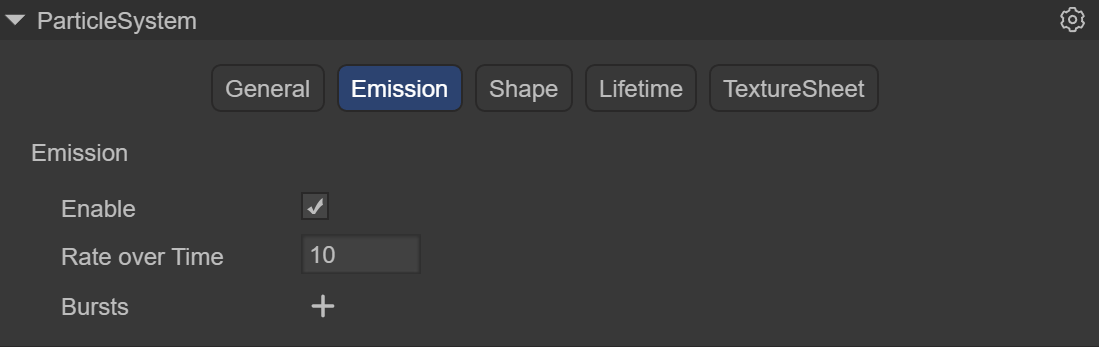 该模块是粒子系统组件的一部分,用来指定发射粒子的属性。当创建新的粒子系统时,Emission 模块会默认启用。