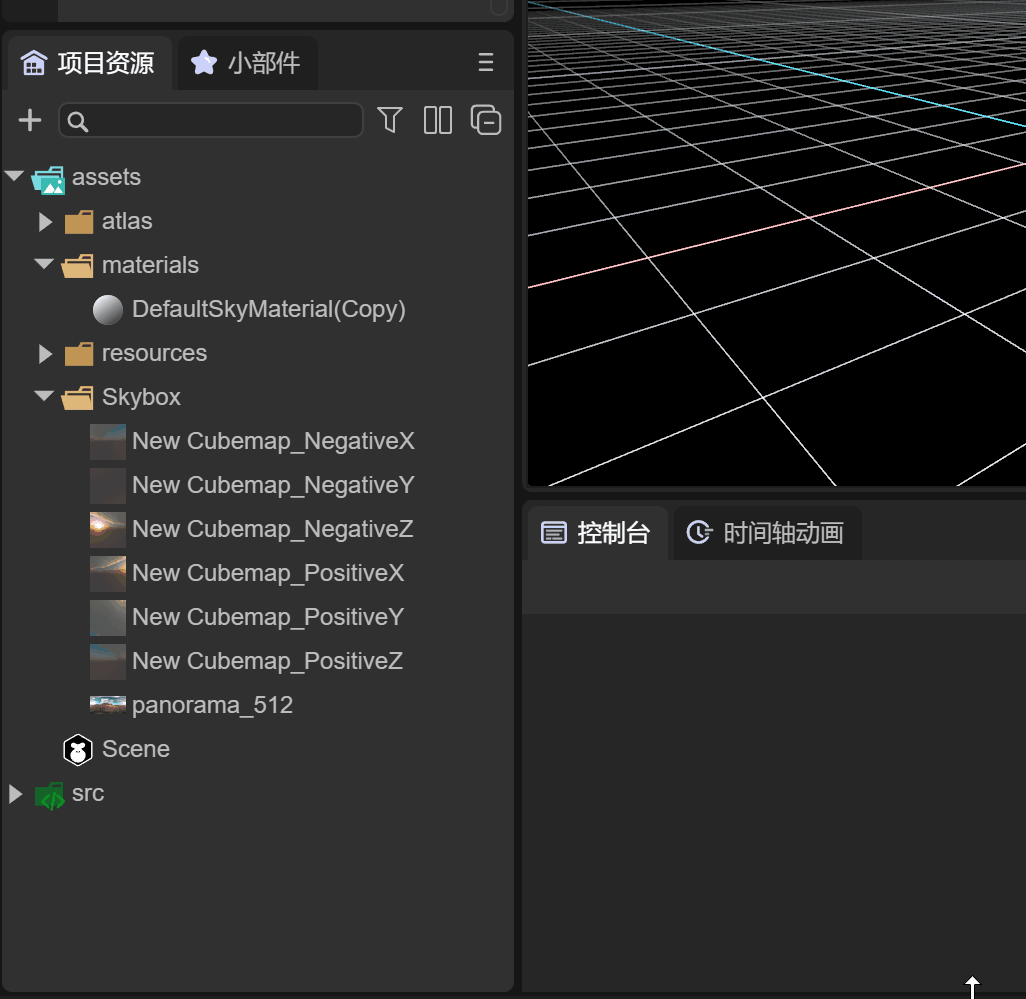 Laya.SkyBox材质是支持6张可以无缝相接的贴图,但是需要先创建一个Cube Texture,如动图2-13所示,在assets目录下创建Cube Texture