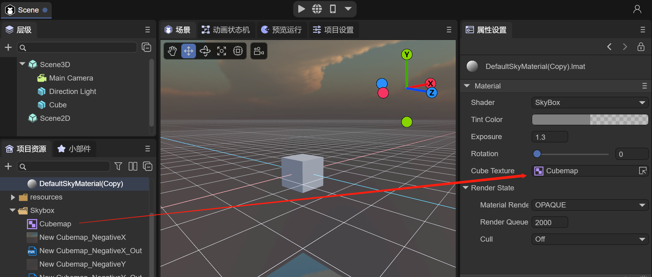 如果开发者像使用立方体天空盒,首先我们更改上述天空盒材质为Skybox,如动图2-12所示