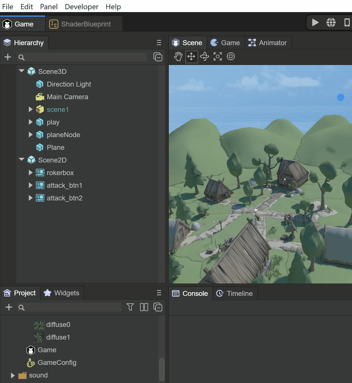 场景即为LayaAir引擎的3D世界容器,用于呈现游戏的3D画面和加载各种3D元素,游戏中的摄像机,灯光,人物,物品等都需要放到场景中才能展示出画面,相当于一个游戏3D播放器或者3D视图。