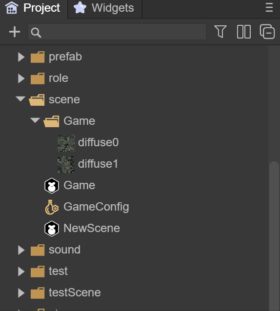 打开3D-RPG项目的Project资源目录,可以看到这里有个scene文件夹,如图7-1所示,这里来存放其它场景文件是比较好的习惯,看起来也比较清晰。
