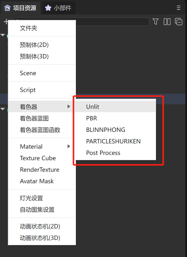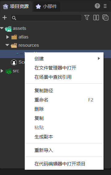 2,点击项目资源面板中的空白处,选择创建,也可以做到快速创建,如动图2-2所示
