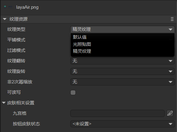 精灵纹理:图片作为2D的Sprite对象的图片纹理格式,通常在2D开发中使用。此属性在图片资源按照官方的命名规则去命名的时候自动为精灵纹理,否则就是默认值,会导致资源显示异常。