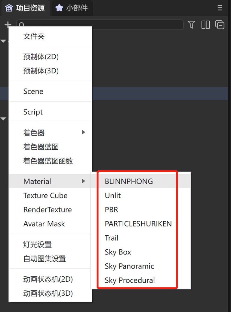 如图2-15所示,在快速创建菜单中,点击“TextureCube”会在assets下快速创建一个TextureCube文件