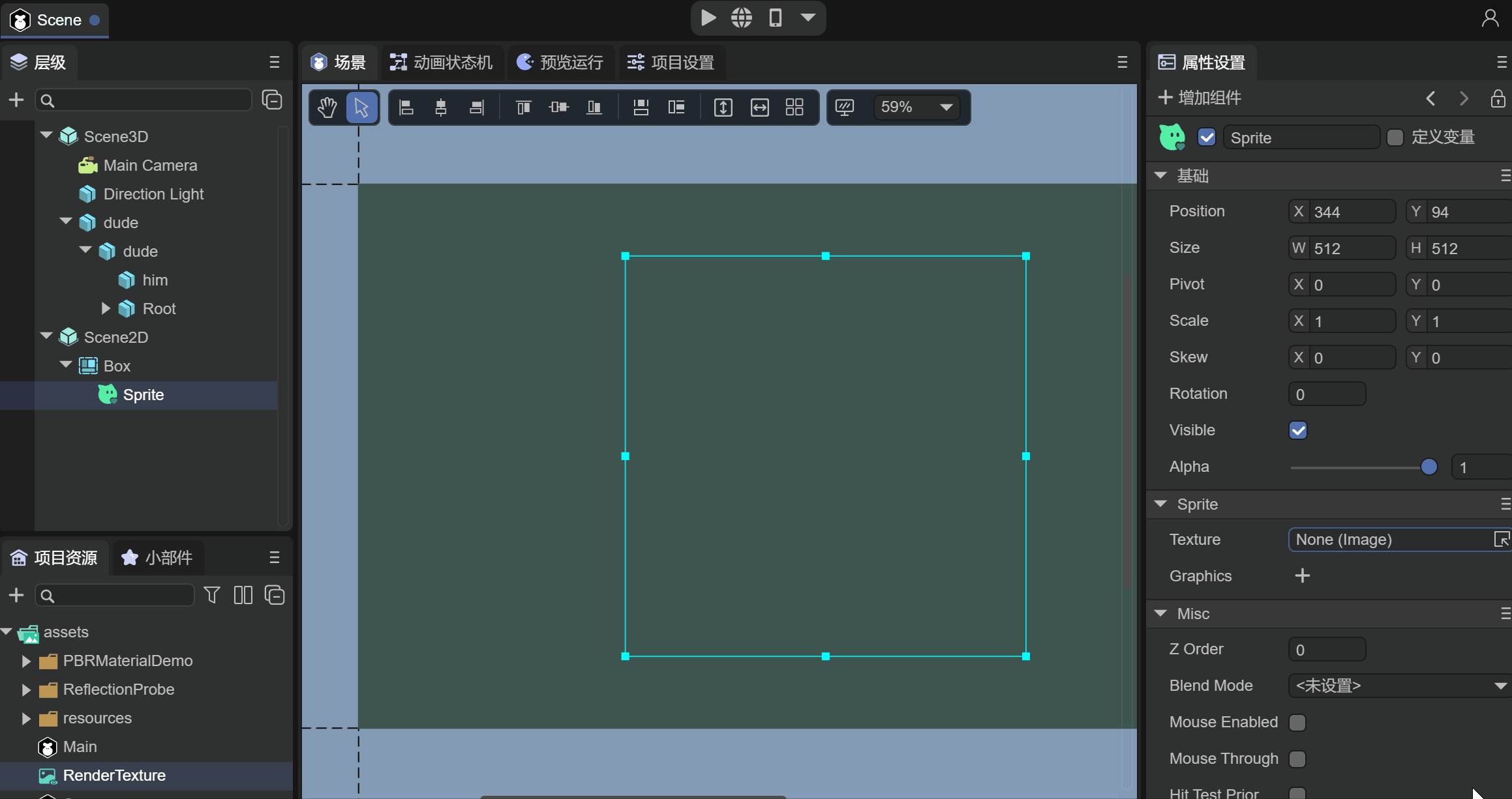 RenderTexture渲染纹理,用于将3D场景渲染到2D纹理中,混合2D开发使用,如动图2-19所示