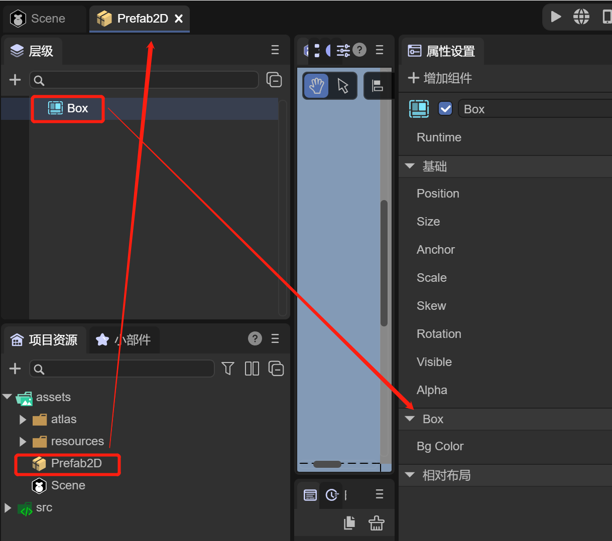 如图2-4所示,创建预制体2D后,点击后打开,预制体只有一个Box根节点,用于2D开发