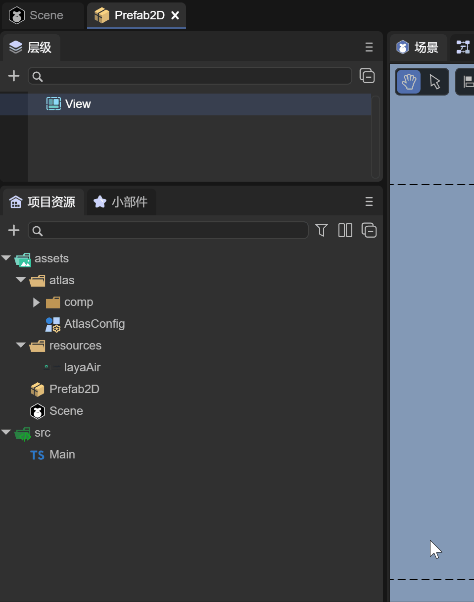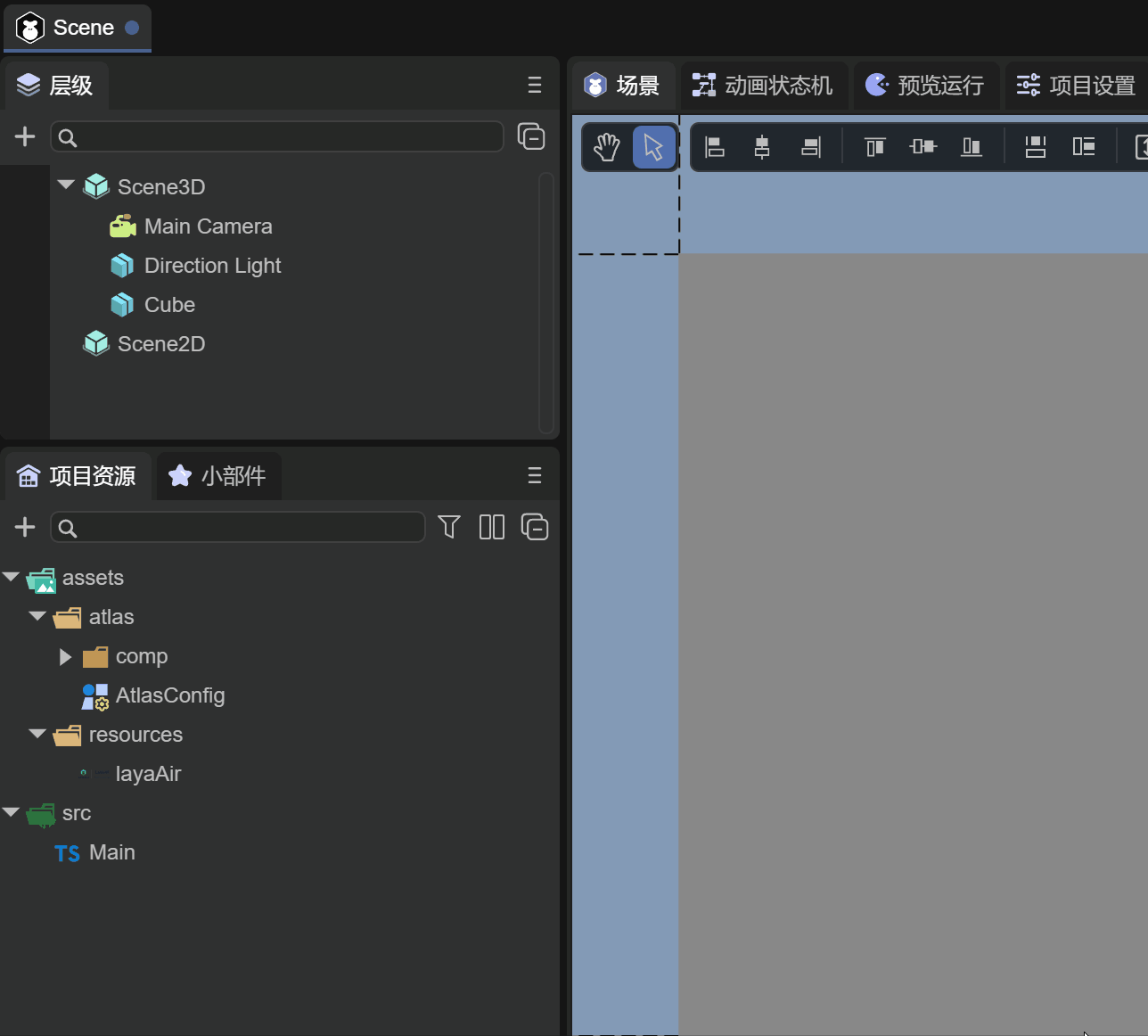 LayaAir IDE打开项目工程后,由五个部分构成,效果如图1-1所示