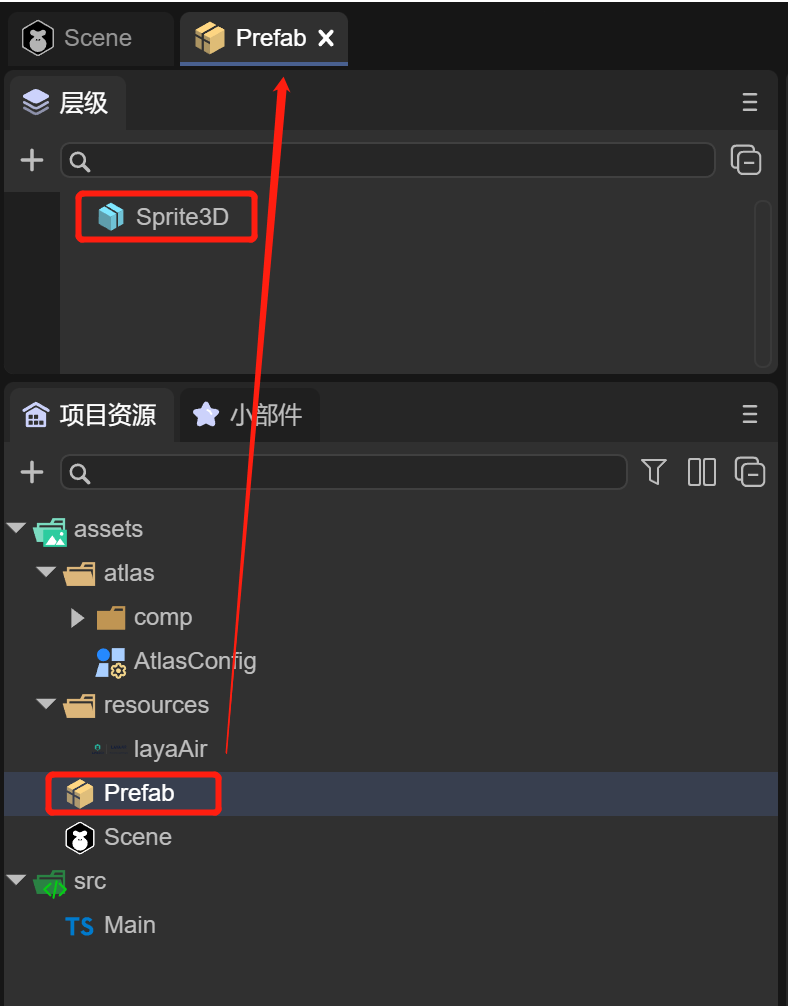 如图2-6所示,创建预制体3D后,点击后打开,预制体只包括Sprite3D对象,用于3D对象开发
