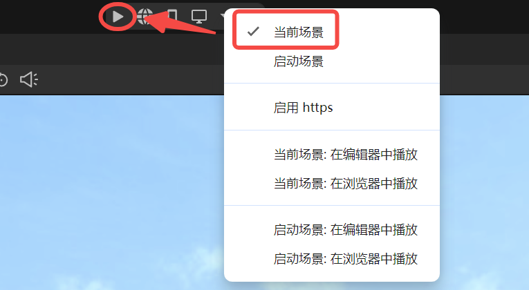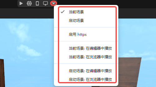 场景预览设置的下拉菜单中,有几个 快捷的功能,分别是:当前场景在编辑器或浏览器中播放预览、启动场景在编辑器或浏览器中播放预览。
