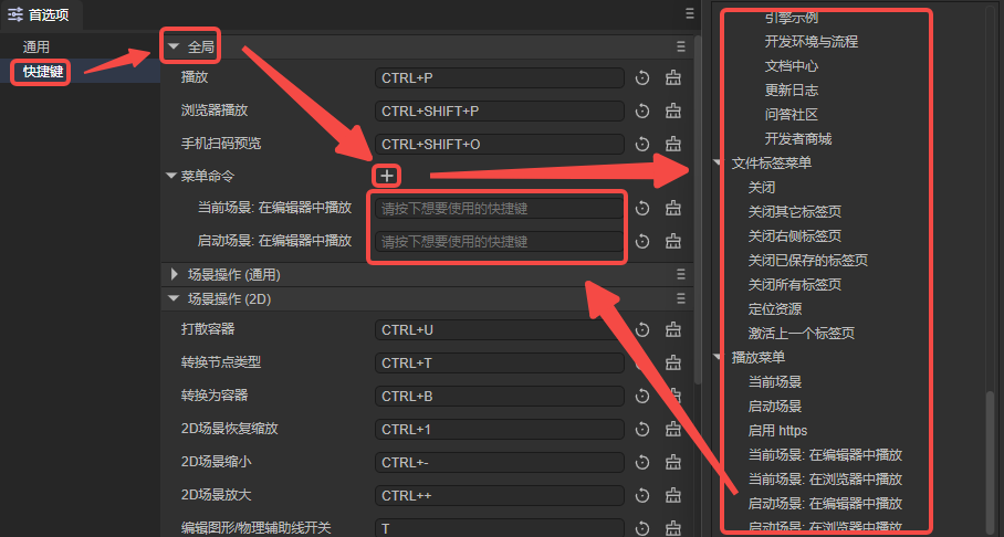 编辑(macOS 为应用程序菜单)→ 首选项 → 快捷键 → 全局,通过点击目标命令旁的“+”号,为其绑定所需快捷键,如图 1-4 所示。