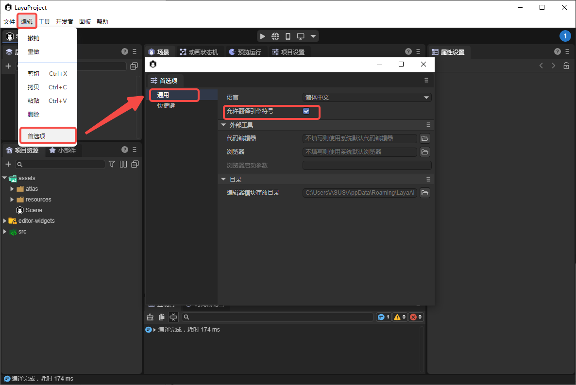 考虑到有些开发者更习惯于英文的属性名称,以便于直观的在代码中使用,还考虑到有的开发者更习惯于中文属性名,以方便理解。因此,可以通过勾选翻译引擎符号使用全中文的界面(Tips中仍然可查看英文属性名),如图1-6所示,去掉勾选,则引擎属性将不翻译。