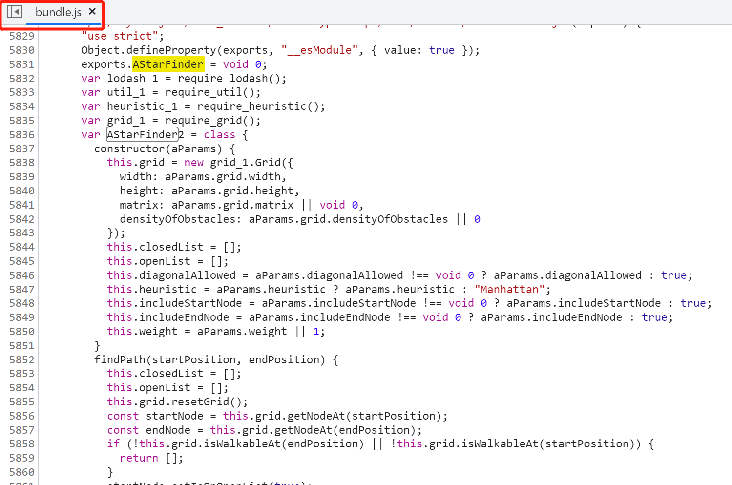 到此为止,第三方模块已经成功导入到项目中了,在IDE中会自动加载,预览和运行都能正常使用。通过开发者工具调试可以看到,引入的AStarFinder类已经成功的集成到发布的代码中了,如图1-4所示