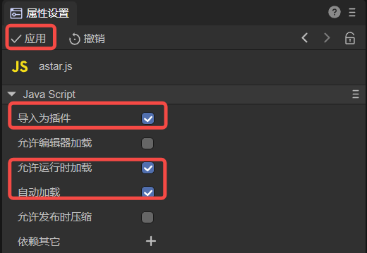 点击 astar.js ,在属性面板中,勾选“导入为插件”,并点击“应用”,如图2-5所示
