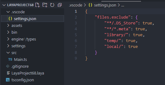 由于LayaAir项目的推荐编码环境是vscode,所以在创建项目的时候,在.vscode里创建 了settings.json,如图3-1所示: