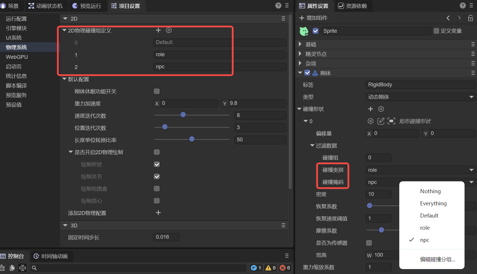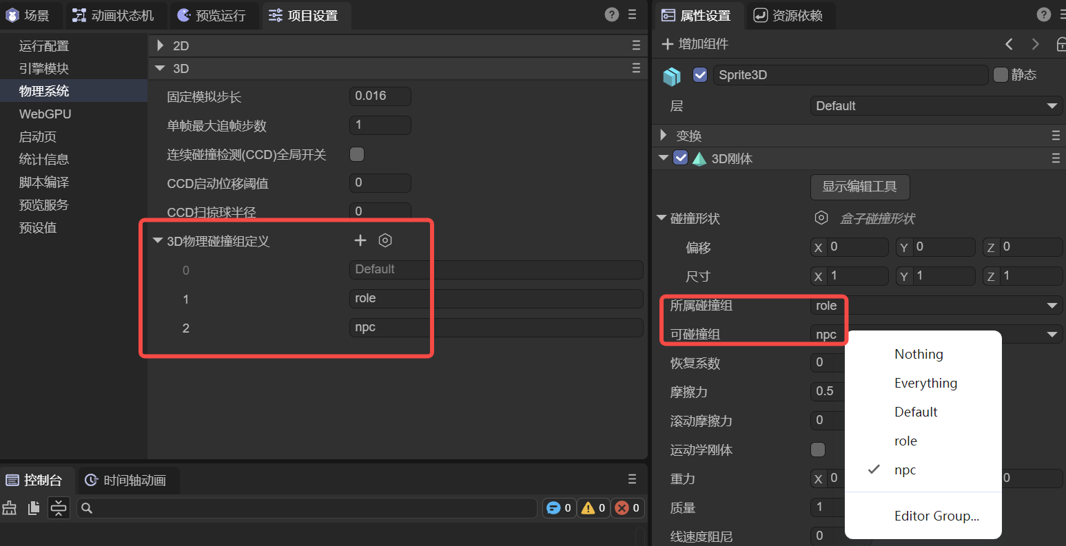 该配置表示:role 类型的碰撞体可以与 npc 类型的碰撞体发生碰撞。当另一个对象的碰撞类别设置为 npc 时,二者在物理世界中即可正常产生碰撞关系。