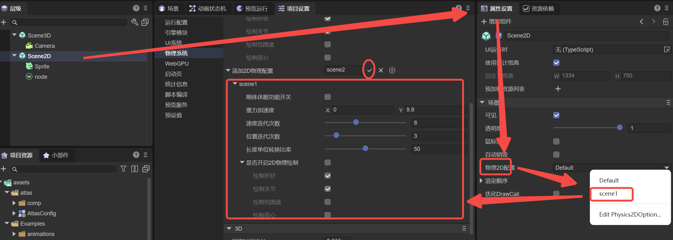 点击 “+” 后,可创建一个自定义配置分组。该分组下将拥有一套 独立的 2D 物理全局参数,并可在场景的 2D 根节点(Scene2D)中进行选择与应用,如图 1-3 所示。