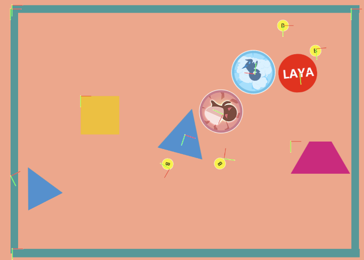 开启后,场景中会显示刚体所使用的碰撞盒、圆形、多边形等实际参与物理计算的形状,如图 1-4 所示。通过该可视化信息,可以直观确认碰撞体的大小、位置与旋转是否与美术节点对齐,常用于排查“看起来碰到了但没有触发碰撞”或“碰撞范围异常”等问题。