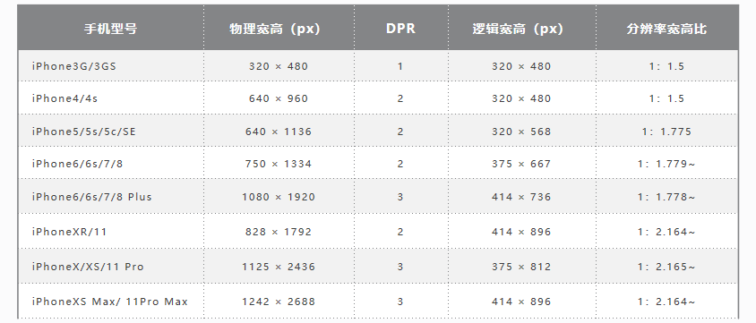 上图中选择的是iphone 6/7/8 Plus设备,但是以iphone为例,随着型号的提升,屏幕设备的分辨率也在不断变化,如图2-2所示