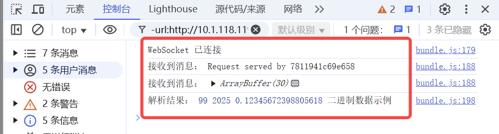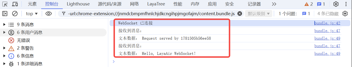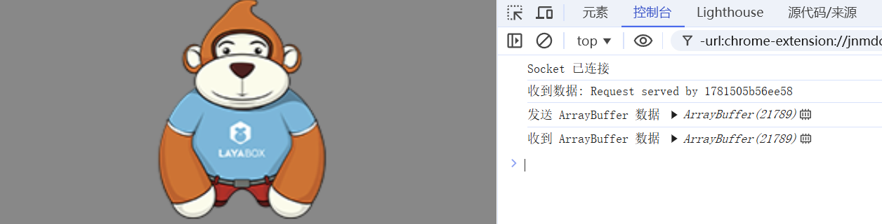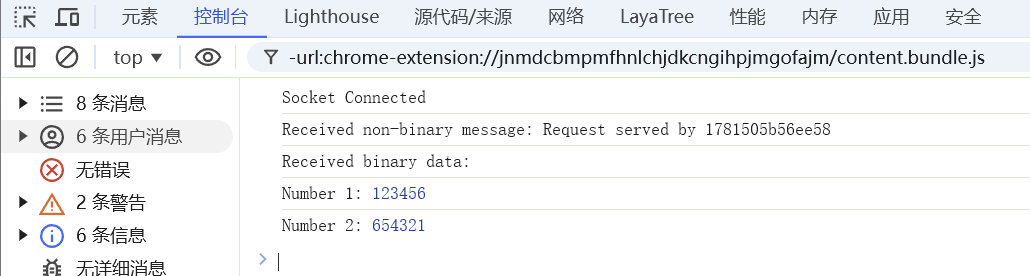 运行效果如图4-1所示,通过Laya.Byte成功发送和接收了二进制数据,并将数据读取打印出来。
