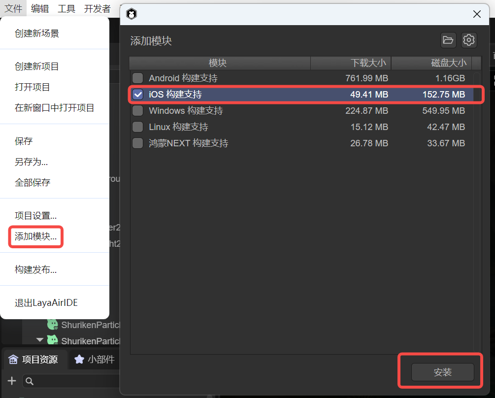 在构建发布iOS之前,我们需要先添加iOS的发布环境模块,如图1-1所示,点击文件菜单栏下的添加模块选项,