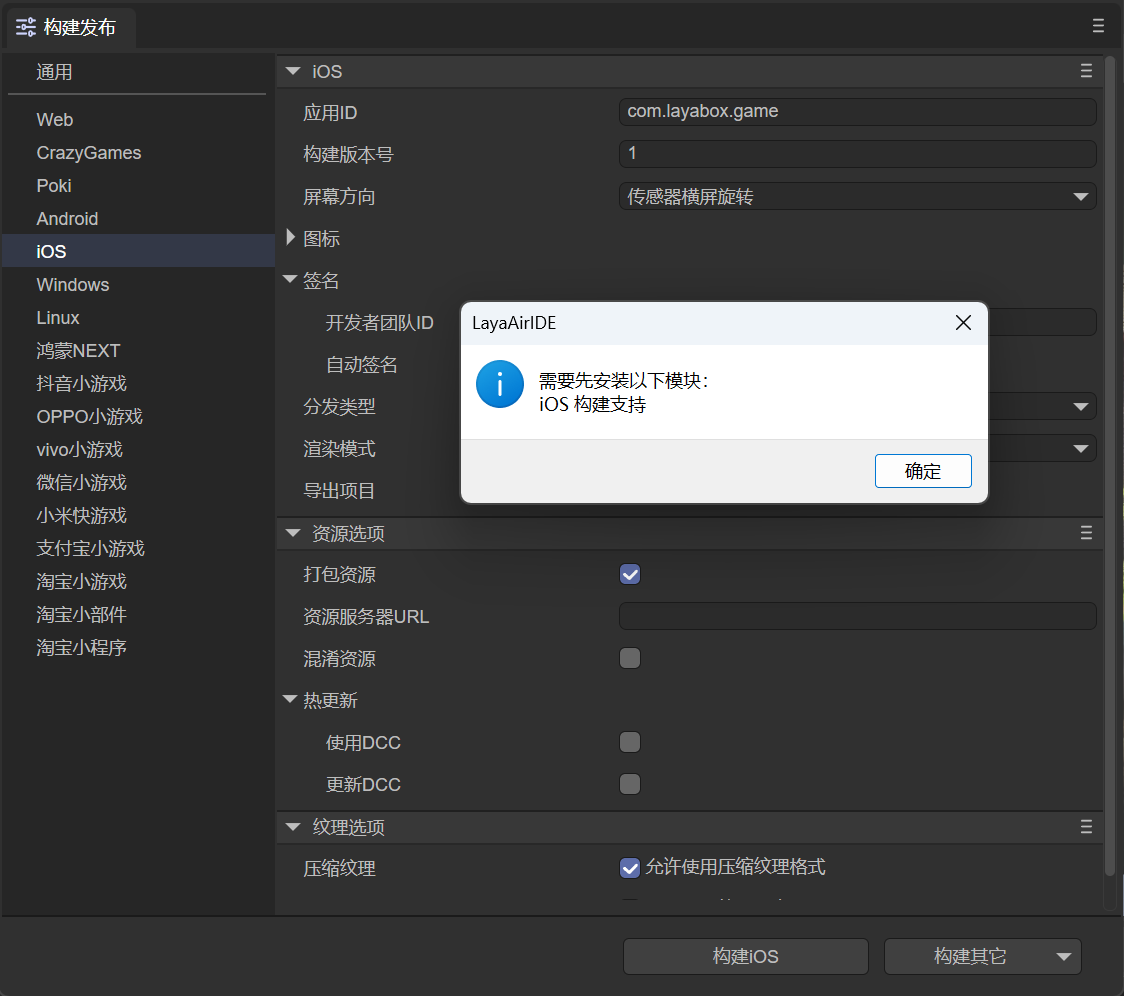 如果我们不先添加发布环境,当点击构建iOS时,也会弹出安装模块的提示,如图1-2所示。