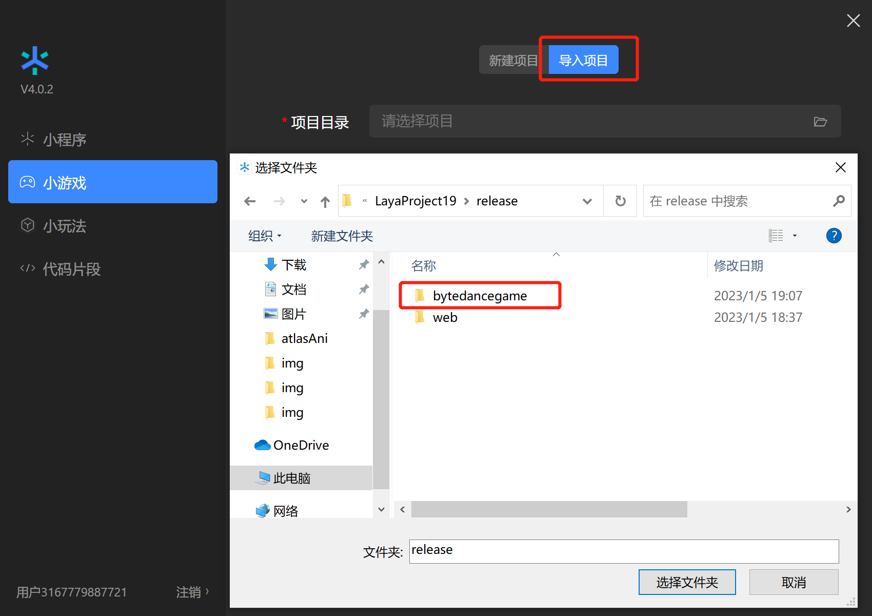 选择导入目录,就是在LayaAir IDE发布后的目标目录(通常在项目根目录下的release\bytedancegame)