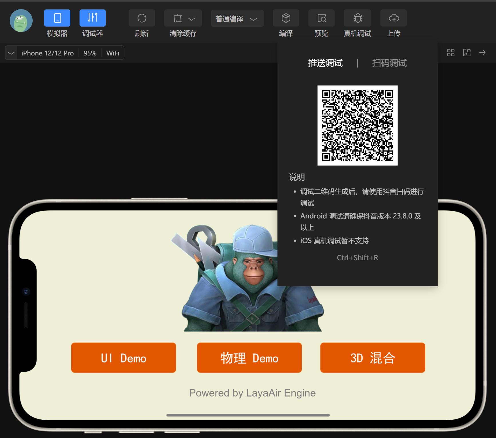 由于LayaAir IDE里也可以调试项目效果,除非是适配相关的问题,基本上两边的效果不会有不一一致的情况。所以这里最重要的是点击预览功能,通过抖音扫码,在抖音内进行真机测试与调试。如图3-5所示