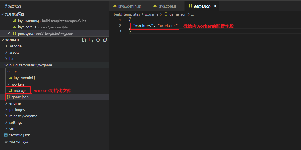 我们在示例项目目录中增加worker目录与game.json中worker的配置目录,如下图所示: