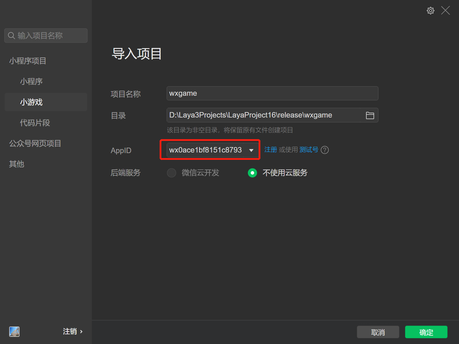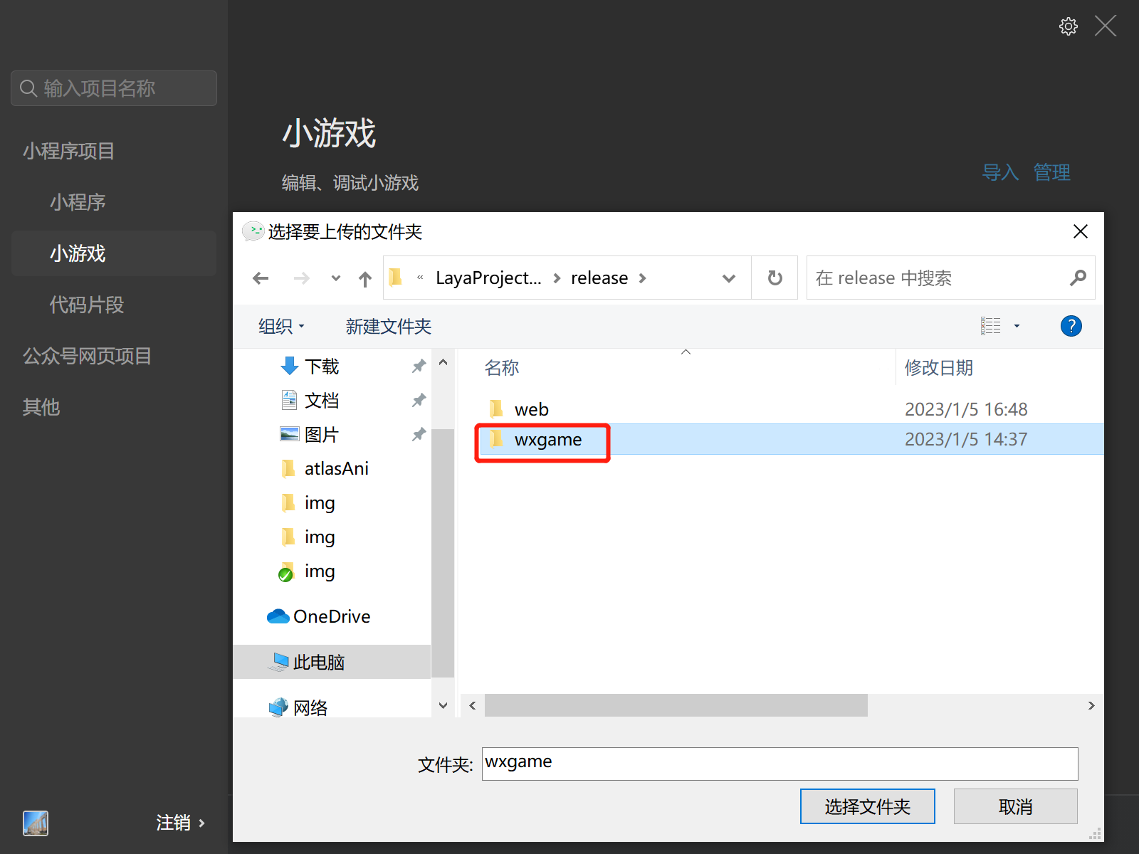 选择项目目录,就是在LayaAirIDE发布后的目标目录(通常在项目根目录下的release\wxgame)