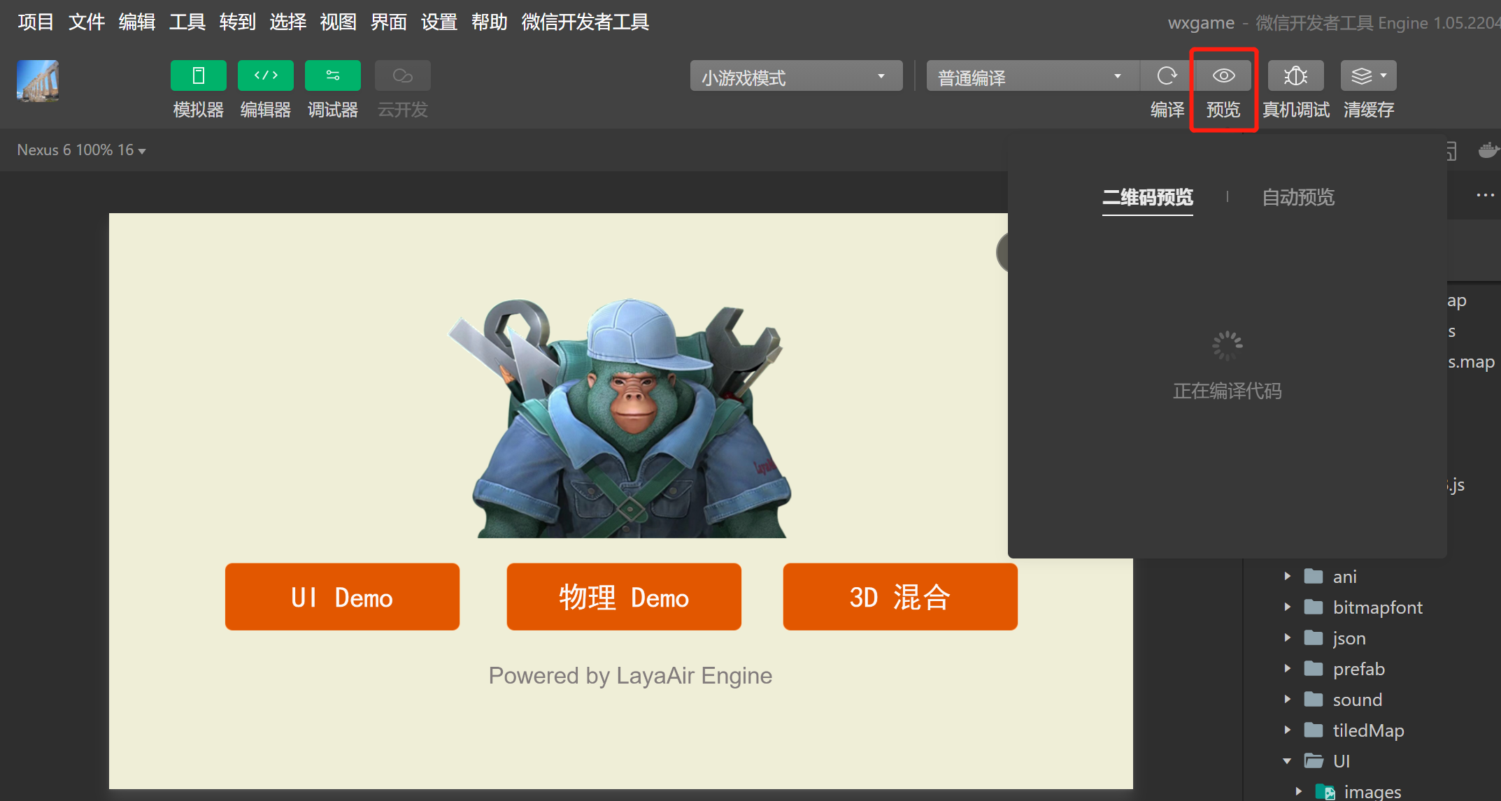 由于LayaAirIDE里也可以调试项目效果,除非是适配相关的问题,基本上两边的效果不会有不一一致的情况。所以这里最重要的是点击预览功能,通过手机微信扫码,在微信内进行真机测试与调试。如图3-5所示
